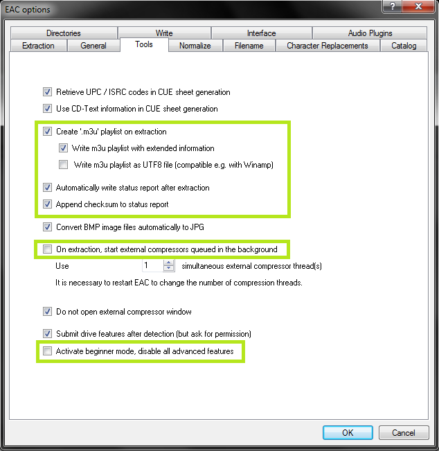 Other than that, these settings are pretty much ideal. I wouldn't recommend using more than 1 compressor thread even if you have a multicore computer. It doesn't take very long compared to the track extraction anyway. Note that in tests run by punkmeup, disabling the queue of external compressors in the background fixed an issue where EAC was generating WAV files instead of FLAC, so I've made that a required option. It should have no bearing on the rip quality. If rip queueing works for you (it does for me), feel free to leave it enabled.