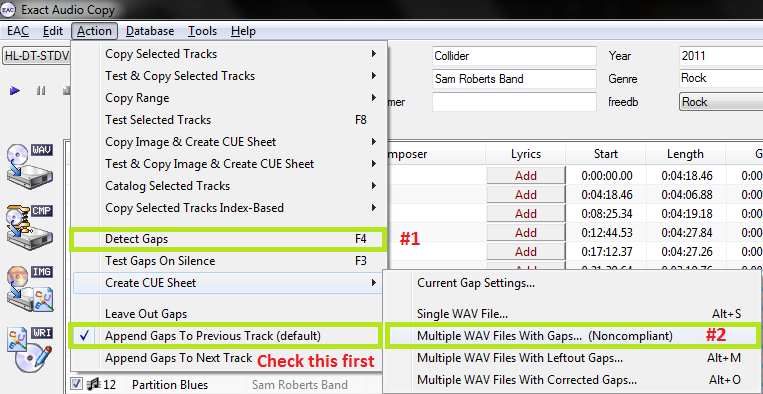 The pre-rip stuff happens here. Make sure "Append Gaps to Previous Track (default)" is checked. It should be. Next, hit the options in the order shown.