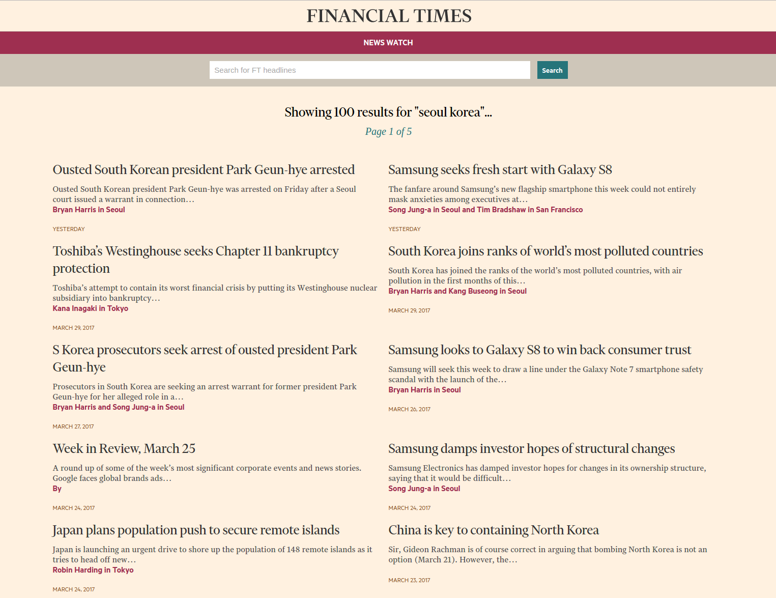 I want to be able to see a list of the latest news headlines from the FT,