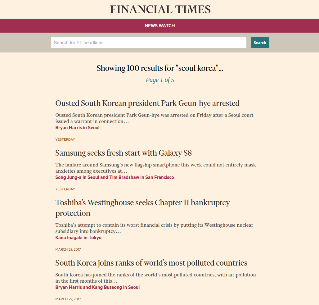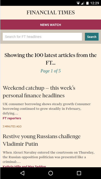 A web application that queries the Financial Times Headline API for articles. By default, it displays the 100 most recent articles from the FT. Alternatively, the user can search to return articles relating to a given topic.