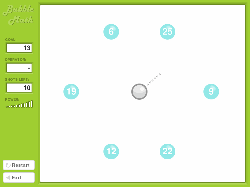 Bubble Math is an edutainment game with mechanics similar to billiards/pool. You shoot your bubble around, knocking other bubbles trying to get them to hit each other so that their numbers together equal the specified goal.