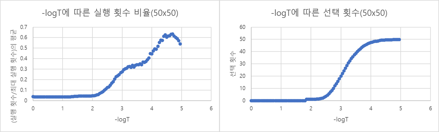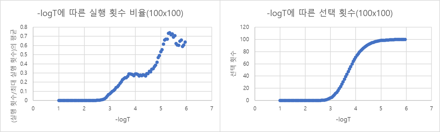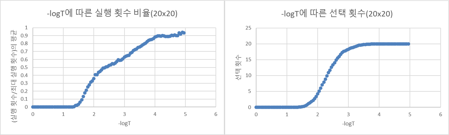 코드를 바탕으로 T에 따른 수렴할 때까지 실행 횟수, 선택 횟수에 대한 데이터를 얻고 그래프로 그린다. (100개의 데이터 셋에 대한 평균으로 구한다.)