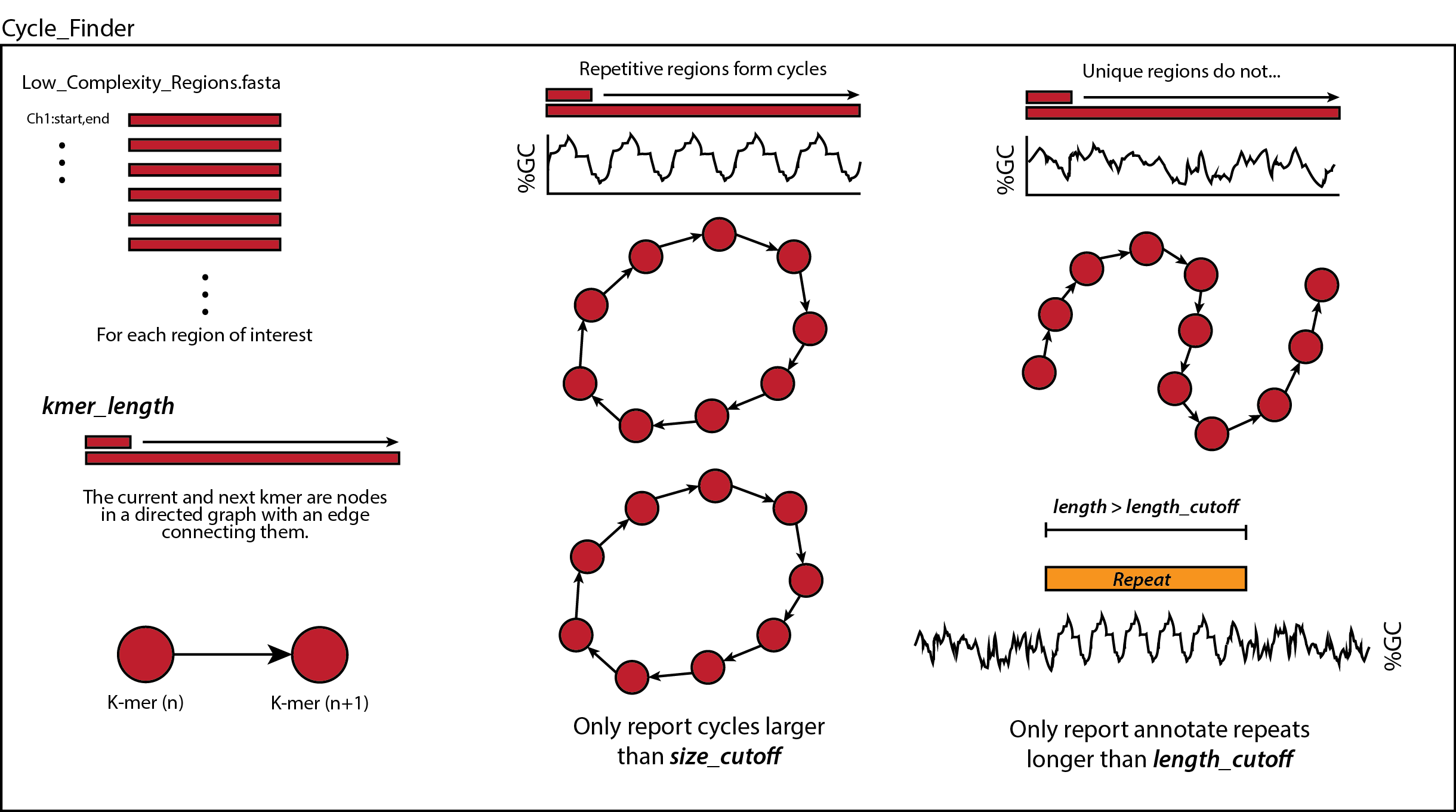 Then, each low-complexity region is further analyzed by cycle_finder. This too converts each region of interest into a directed graph of k-mers. Each node represents a k-mer, and each edge represents a k-mer transitioning from one to another. The edges are weighed by how often that transition is observed, normalized by the sum of all outgoing edge weights, then the -log is taken to ensure that frequent transitions are small positive values and infrequent transitions are large positive values. This step is important since the consensus sequence is determined to be the cycle which maximizes the number of nodes visited while minimizing the sum of edge weights. Importantly, repetitive sequences produce cyclic graphs while unique regions do not. Once all regions have been analyzed and repetitive sequences have been found, only repeats that are larger than size_cutoff and occupy space on the genome larger than length_cutoff are reported.