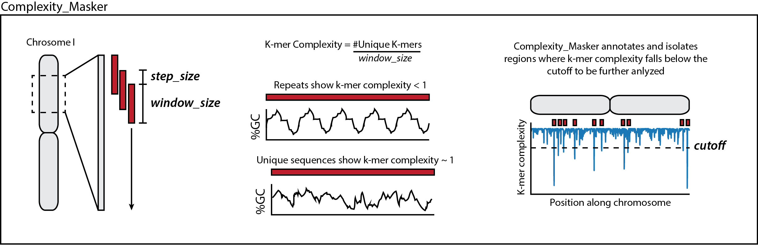 First, complexity_masker slides a window across each chromosome or contig in your genome file. It then calculates a k-mer complexity score for each bin. After calculating the k-mer complexity score across all provided sequences, it identifies regions of the genome where the k-mer complexity fell below the designated cutoff (default is 0.8).