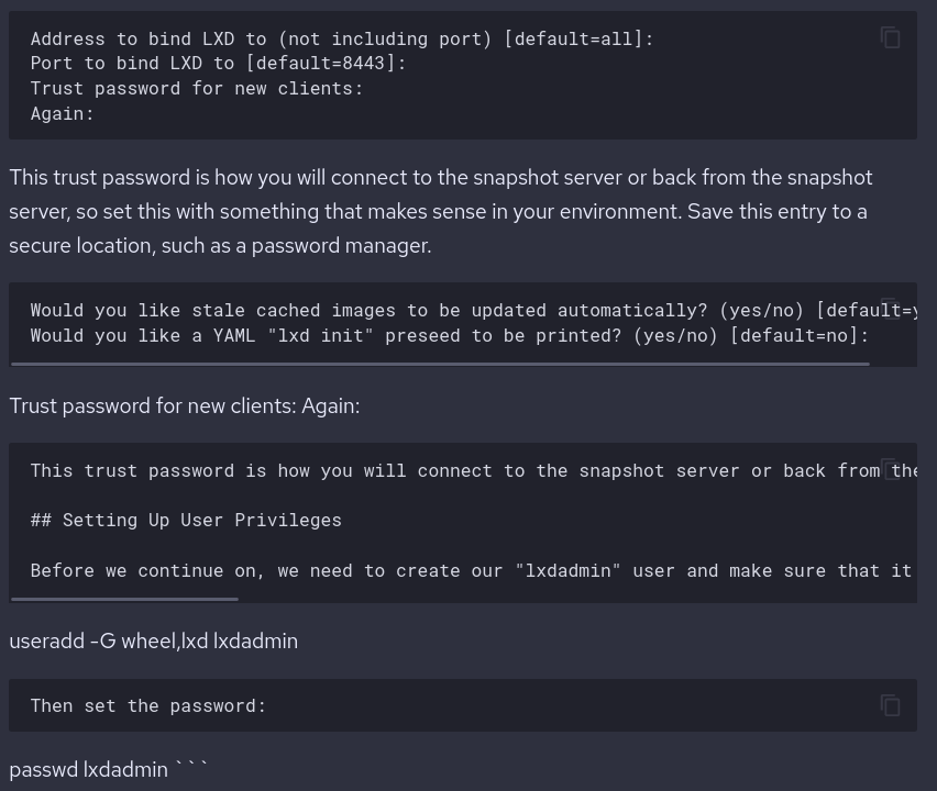 This is the current state (https://docs.rockylinux.org/books/lxd_server/03-lxdinit/): The "Trust password for new clients:" text should appear only once, after setting the address and port for the snapshot server. It is duplicated after the YAML section, along with the trust password explanation. Furthermore, the erroneous backticks prevent the sentence "Setting Up User Privileges" appearing as a heading, and break the rendering of everything that follows (code blocks and paragraphs are reversed). |