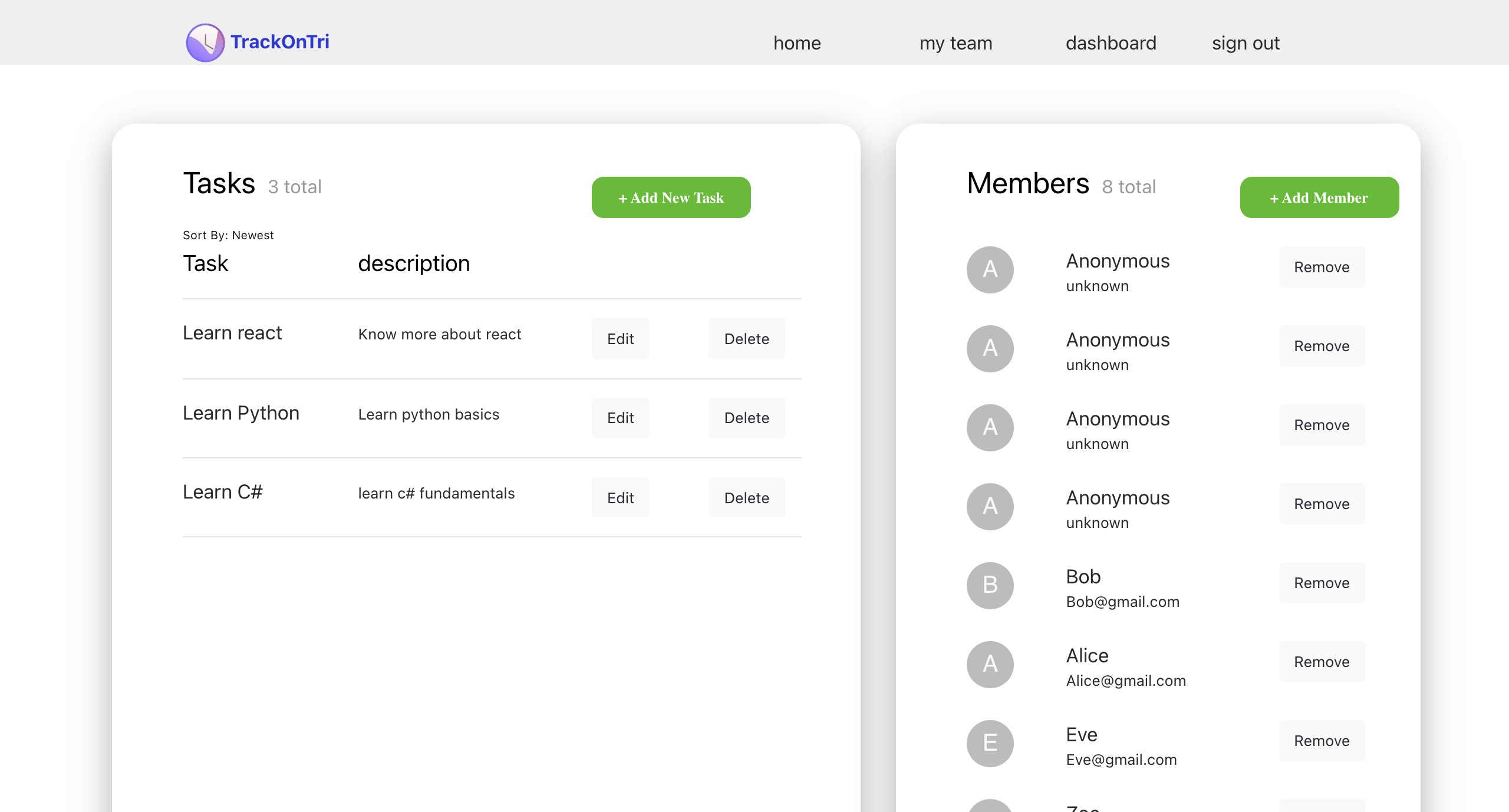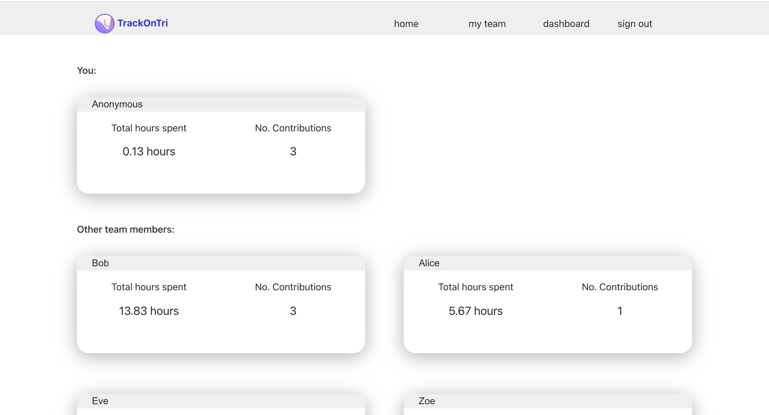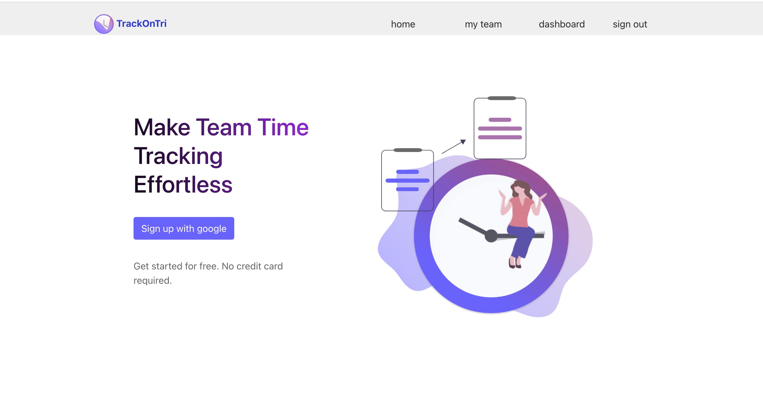 TrackOrTri Time Tracking System for Teams This is a a web application built within 36 hours for the Codebrew Hackathon on April 2021. The inspiration of this applciation is to make a free, lightweight web application that makes collaborative time tracking easy for teams. demo link : https://trackortri.web.app/ ScreenShots :