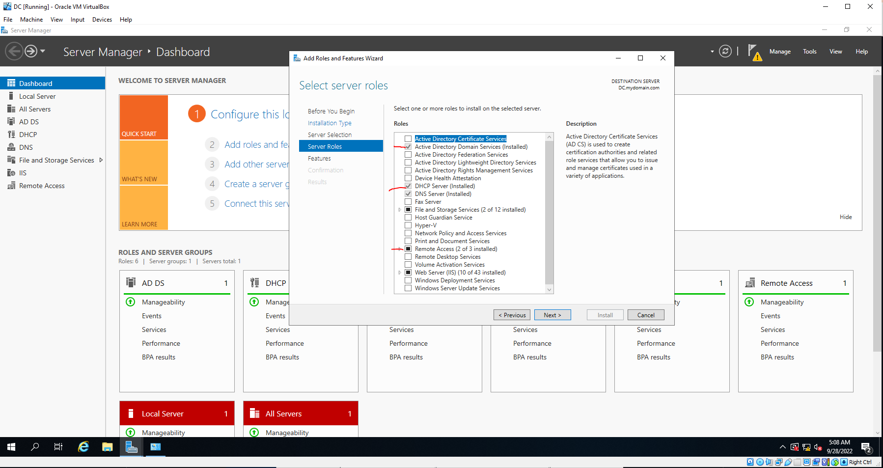 Configure Local Server to install Active Directory Domain Services, Remote Access, DHCP Server