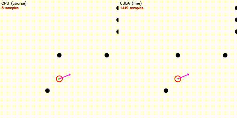 GPU enables orders-of-magnitude more particles/samples, resulting in visually better results. All comparisons below use the same algorithm on CPU and GPU — the only difference is sample/particle count enabled by GPU parallelism: