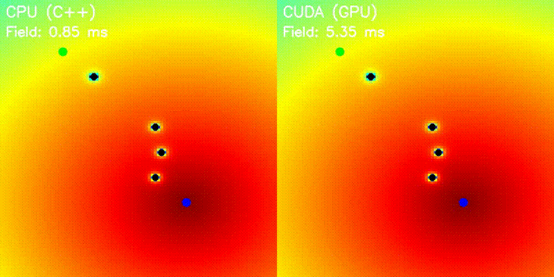 GPU computes the entire potential field in one kernel launch: each thread calculates one grid cell's attractive potential (toward goal) and repulsive potential (from all obstacles). Path following uses gradient descent on CPU.