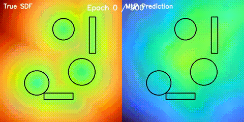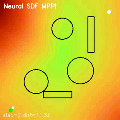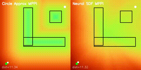 Learns 2D signed distance fields with a GPU MLP, then uses them for potential-field planning and MPPI on non-circular obstacle layouts. |