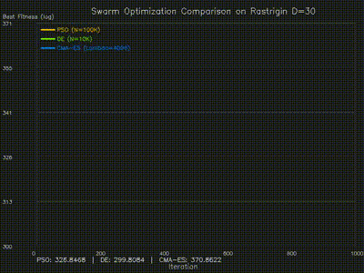 Large-scale PSO, DE, CMA-ES, and ACO implementations with animated convergence comparisons. |