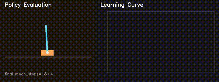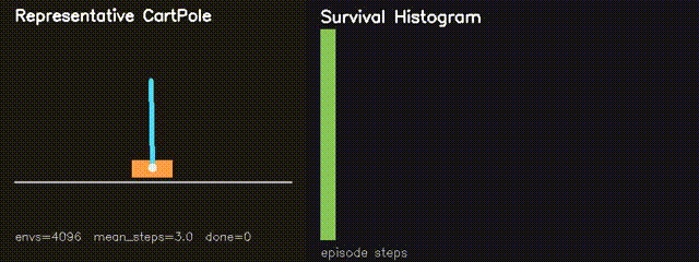 | MiniIsaacGym RL | GPU REINFORCE CartPole: average survival 82.6 to 180.4 steps in 160 generations. |