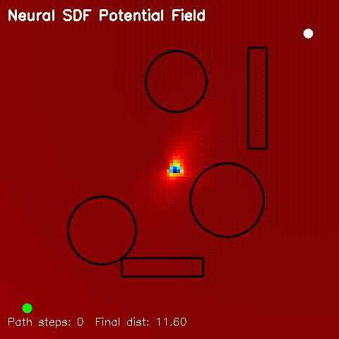 | Neural SDF navigation | Learned 2D SDFs with potential-field planning and MPPI rollouts on non-circular obstacle layouts. |