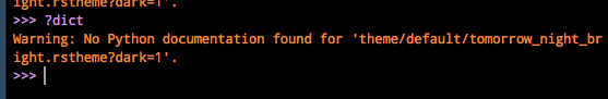 >>> ?dict Warning: No Python documentation found for 'theme/default/tomorrow_night_bright.rstheme?dark=1'.