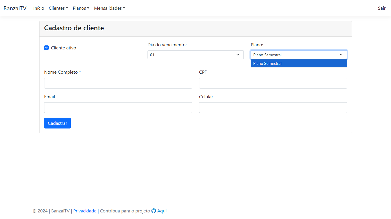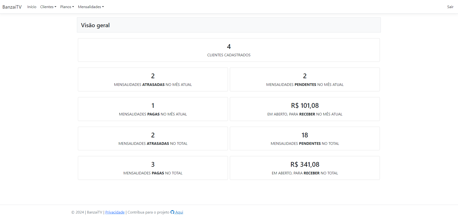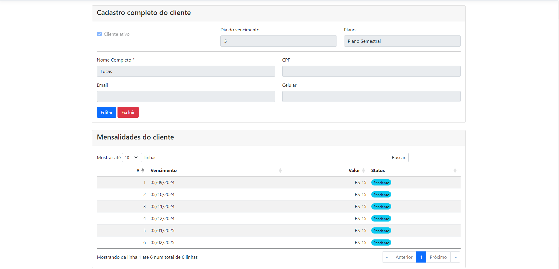 - O administrador pode lançar manualmente as mensalidades para os clientes. Além disso, o sistema gera automaticamente as mensalidades no momento do cadastro do cliente, de acordo com o plano escolhido.