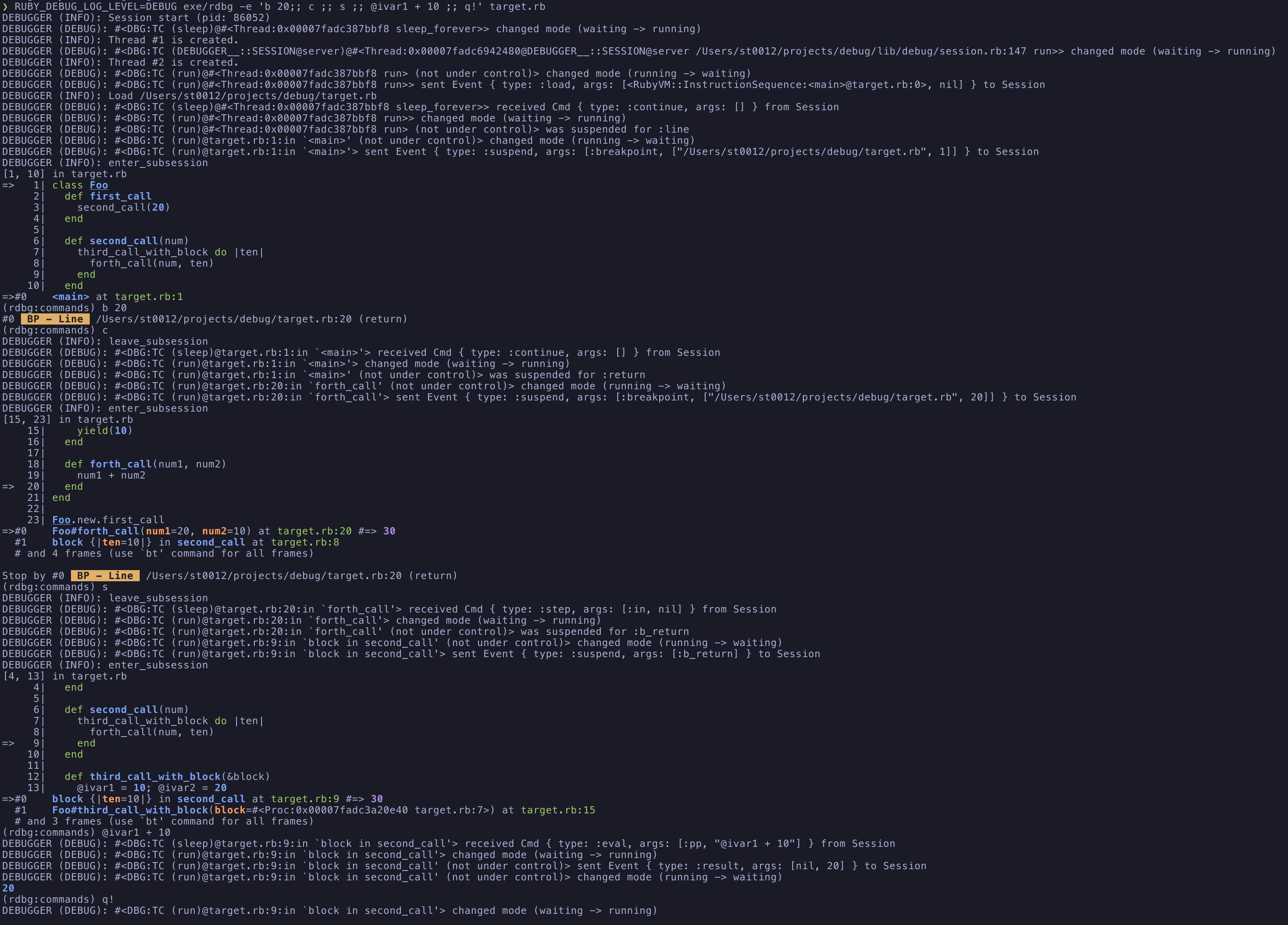 When working on features that involves Session <-> ThreadClient interaction, like #422, I often put multiple puts/pp in different places to see what's happening in the debugger. And then I feel that they're mostly about: