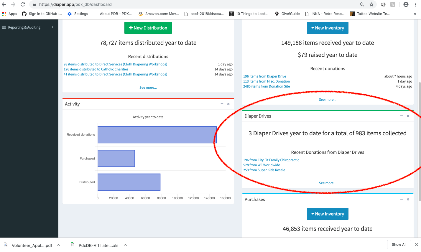 The diaper drive widget on the dashboard isn't adding correctly. It currently says that we've raised 983 items from 3 diaper drives year to date: