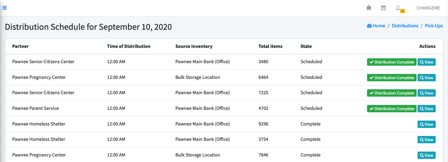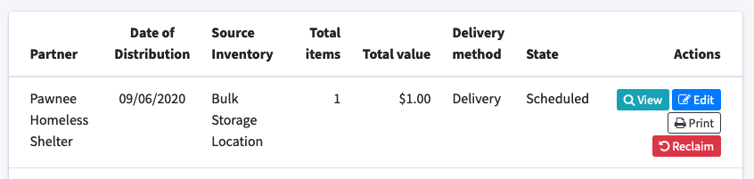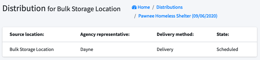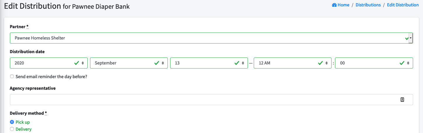 When a distribution of materials is scheduled, we want to be able to record how the materials will be delivered. Are the materials being picked up at the bank? Is the bank delivering the materials to the partner organization? Distributions will now be marked as either "Delivery" or "Pick up".
