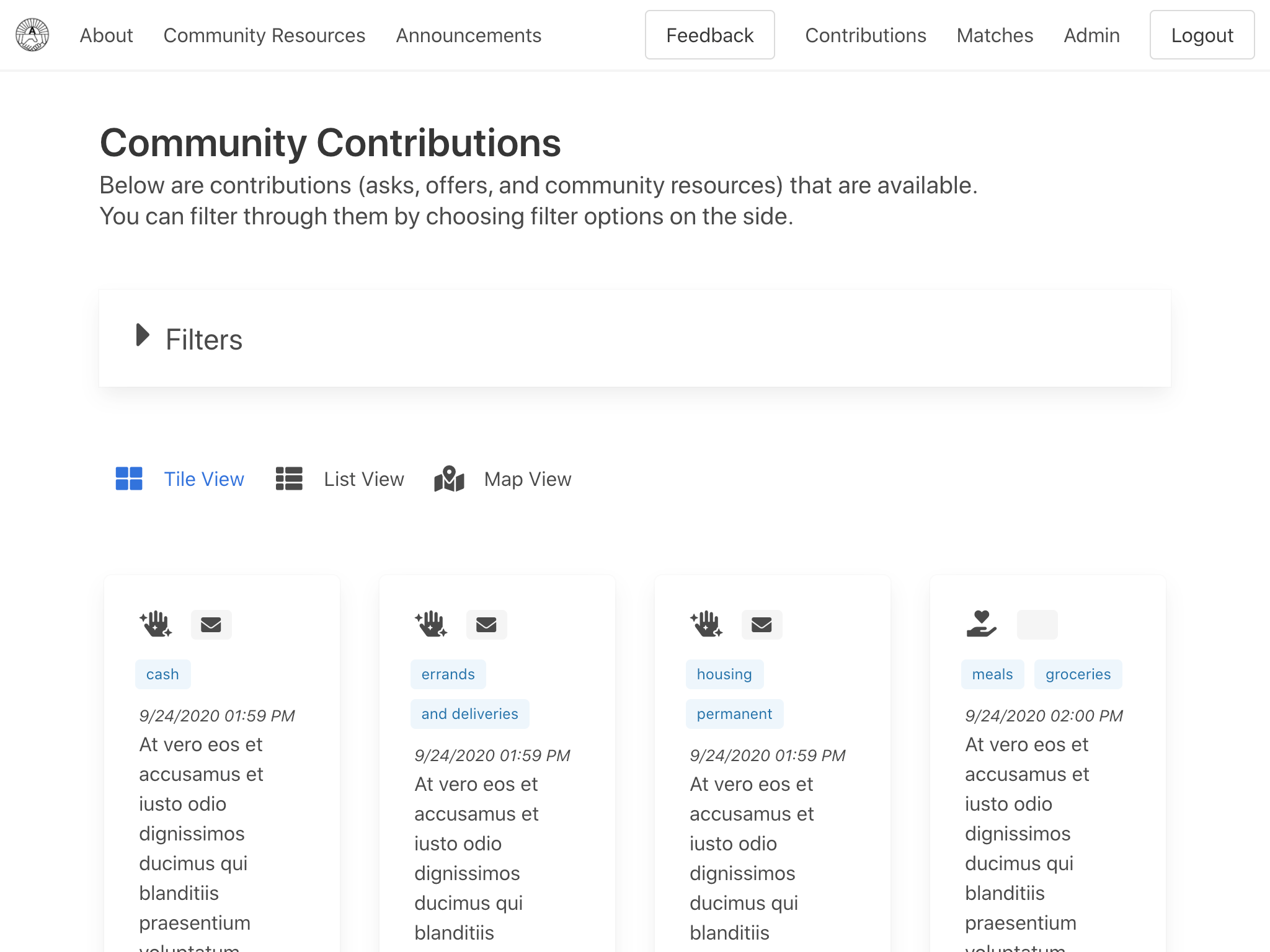 Updates the contributions view layout for browse (tile|list|map) buttons, tiles and list view items. Relates to #282.