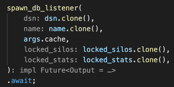 It seems that the parameter name inlay hints are smart enough that when I pass a variable named cache or args.cache into the function's cache parameter, it doesn't duplicate the parameter name there. But if I pass name.clone() to the name parameter, it treats that as a different thing, even though I as a (admittedly non-expert) user would say that that's redundant - should the parameter names be hidden here?