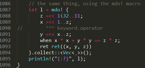 forward_ref_binopwhich containstype Output = <$t as $imp<$u>>::Output;there is a more precise way to deal with this and it fixes other macro syntax highlighting such as in mdo (although it uses a custom operator so all bets are off)