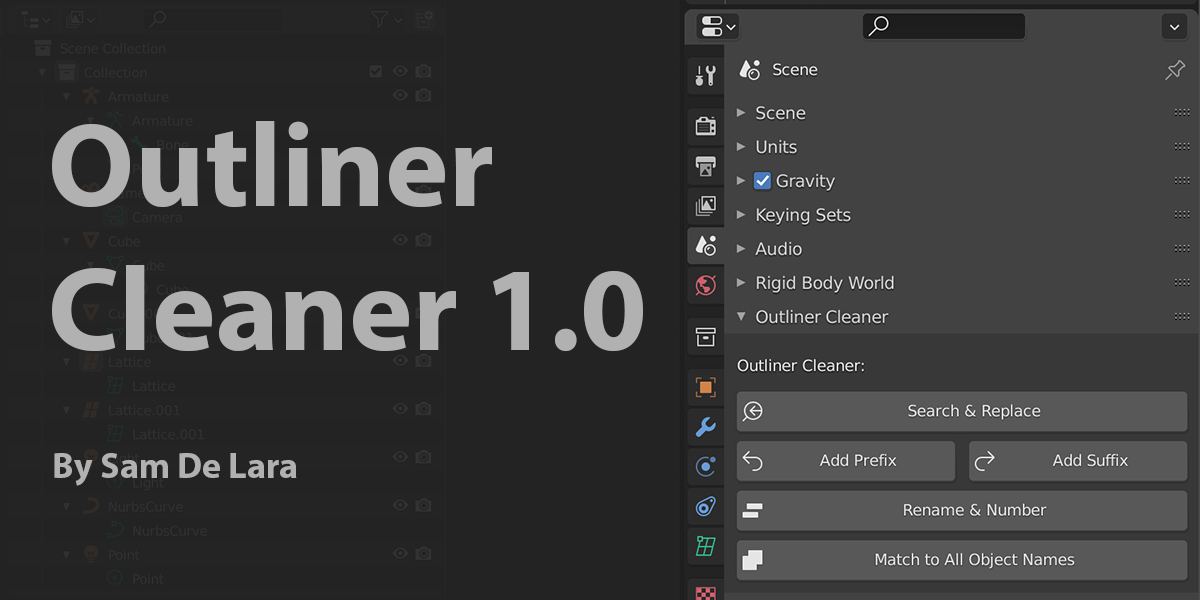 Welcome! This add-on is meant to make it easier to organize and rename the outliner of most versions of Blender above 2.80. This tool was created to speed up the process with organizing a user's outliner in Blender. Natively, it is very hard to edit multiple names of objects at once and it is hard to even name all of them an iteration of the same name. I knew many other developers felt this frustration and is why I created this tool not only for me, but for all to use.