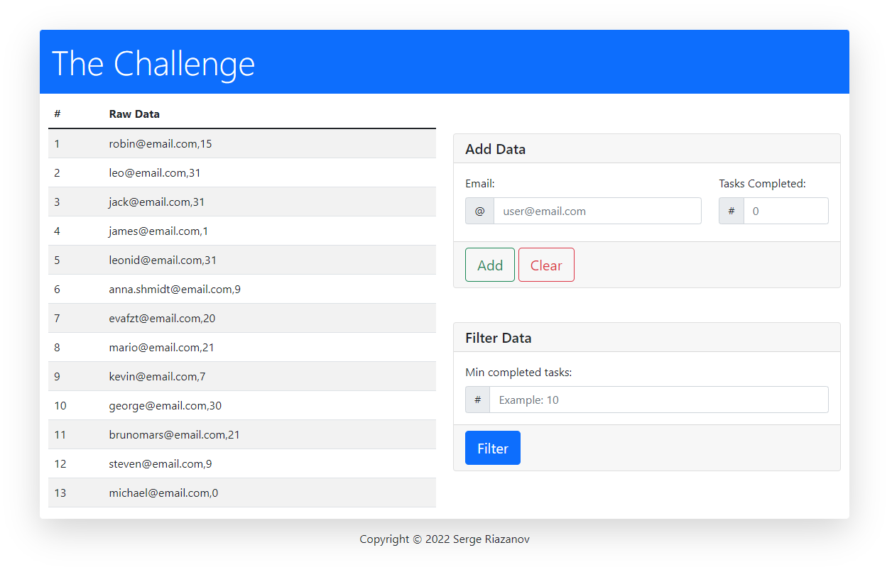 The challenge: Consider a list of strings containing pairs of emails and a number of completed tasks in a month, separated by a comma. Build an algorithm to return the list of emails ordered by highest to lowest number of completed tasks. In case of tie (same number of completed tasks), order by email in alphabetical order. The algorithm should return only the emails which have completed 10 or more tasks. Please return an array with the ordered list of emails.
