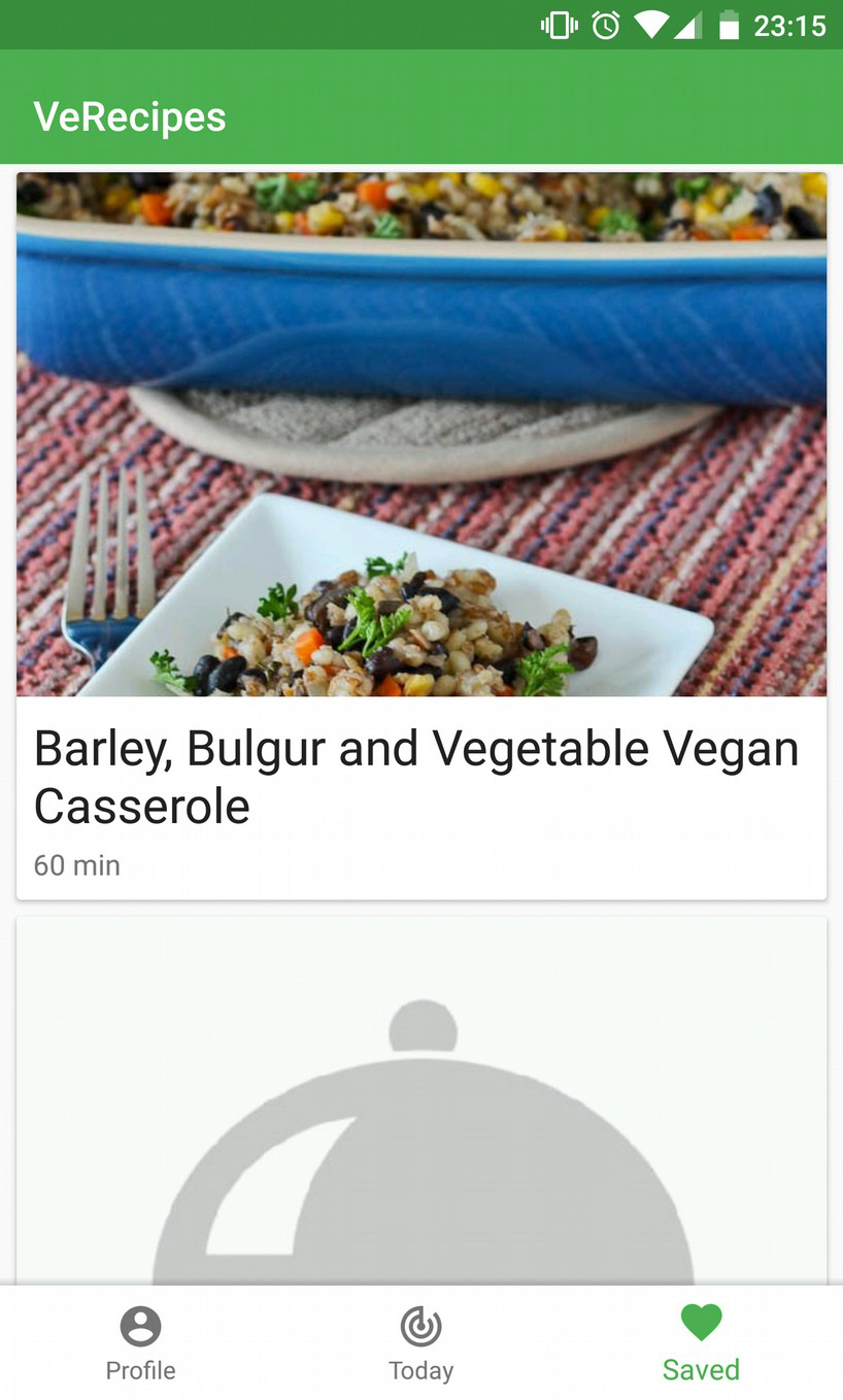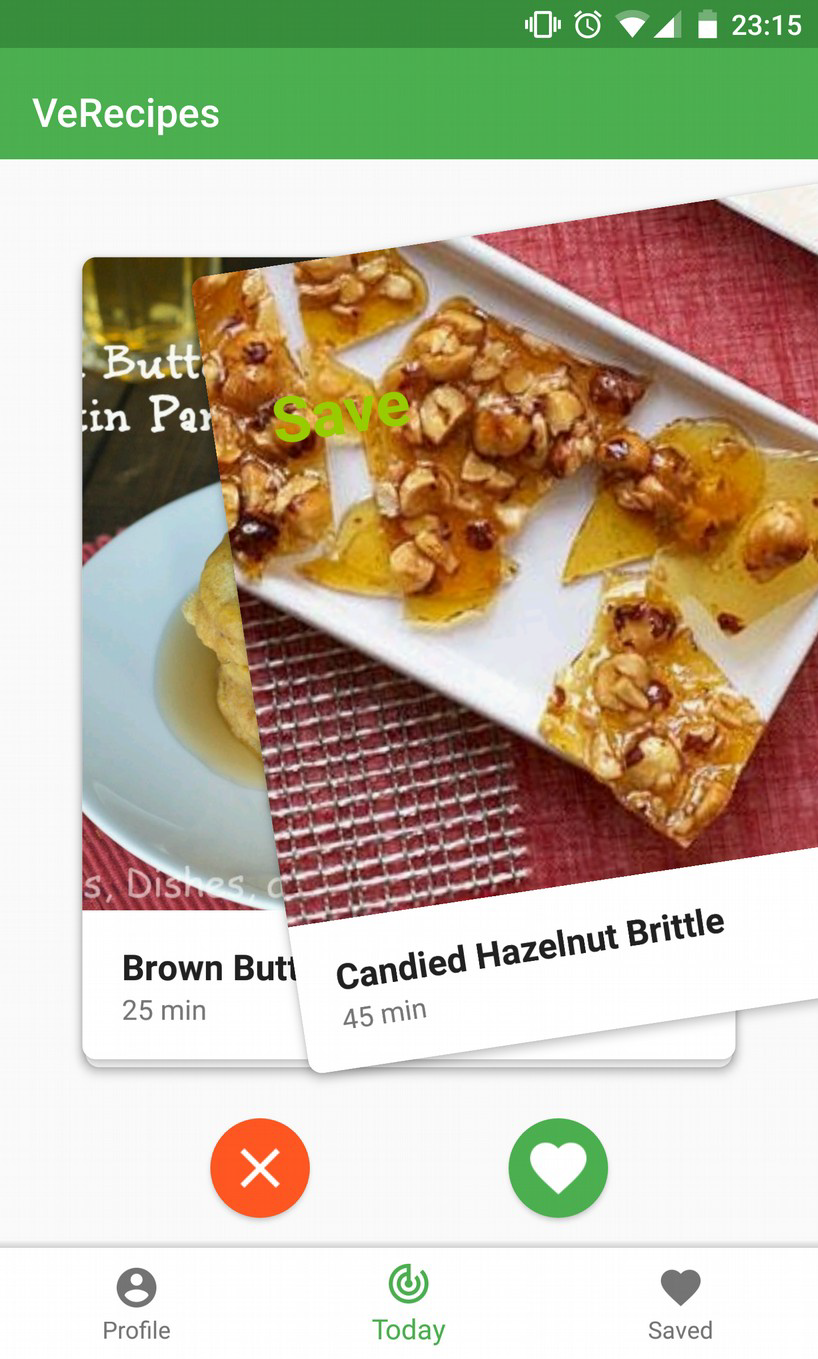 Each day, some new vegetarian recipes will be shown to you. Swipe the ones you like right to save them.