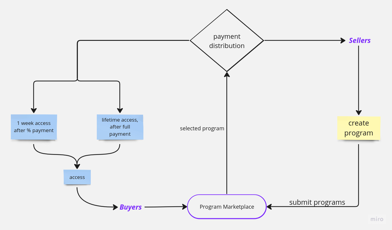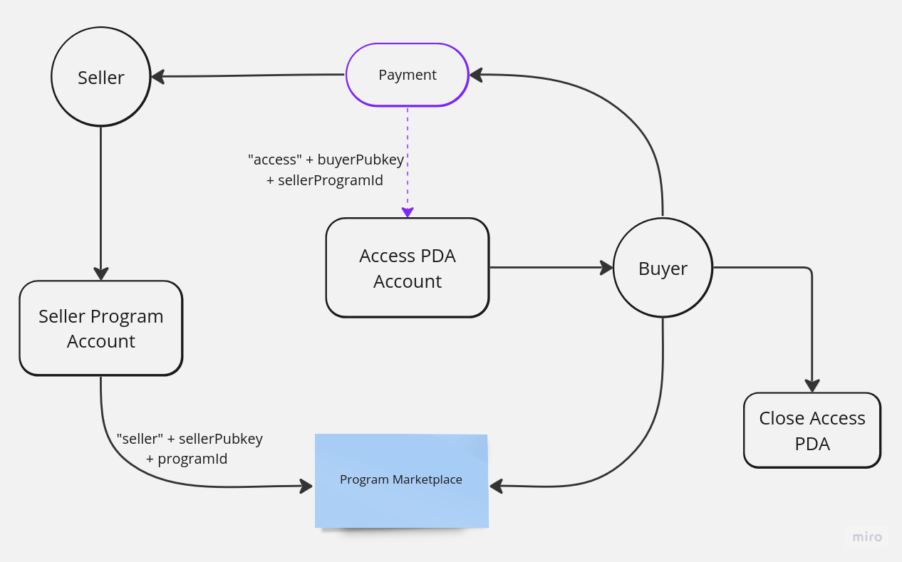 a marketplace or an infrastructure to monetize solana programs. focussing on both buyers and sellers is crucial to create a fair market. so this uses PDA and not spl-token(which is the norm in marketplace). this is intentional. this avoids trading program access which affects the sellers in the market. and buyers are protected by provided a trial period with a minimal cost when they can test the functionality and usefullness for thier application.
