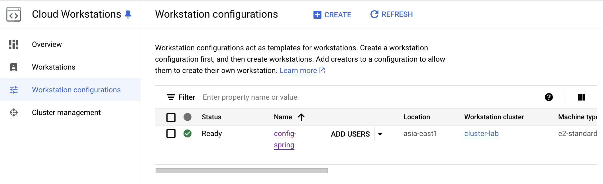 Navigate to Google Cloud Workstations page, select Cluster Manager, and create a Workstation Cluster.