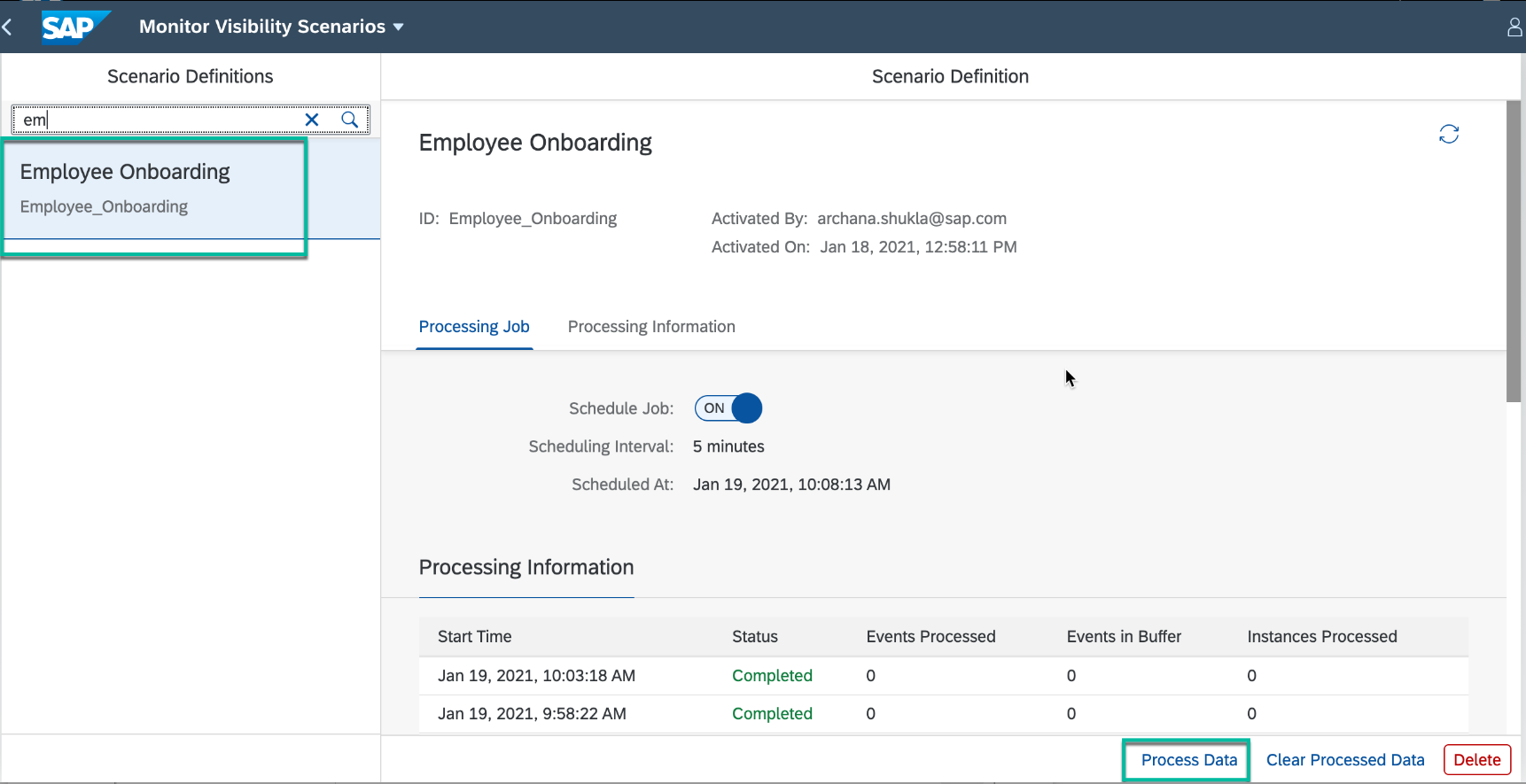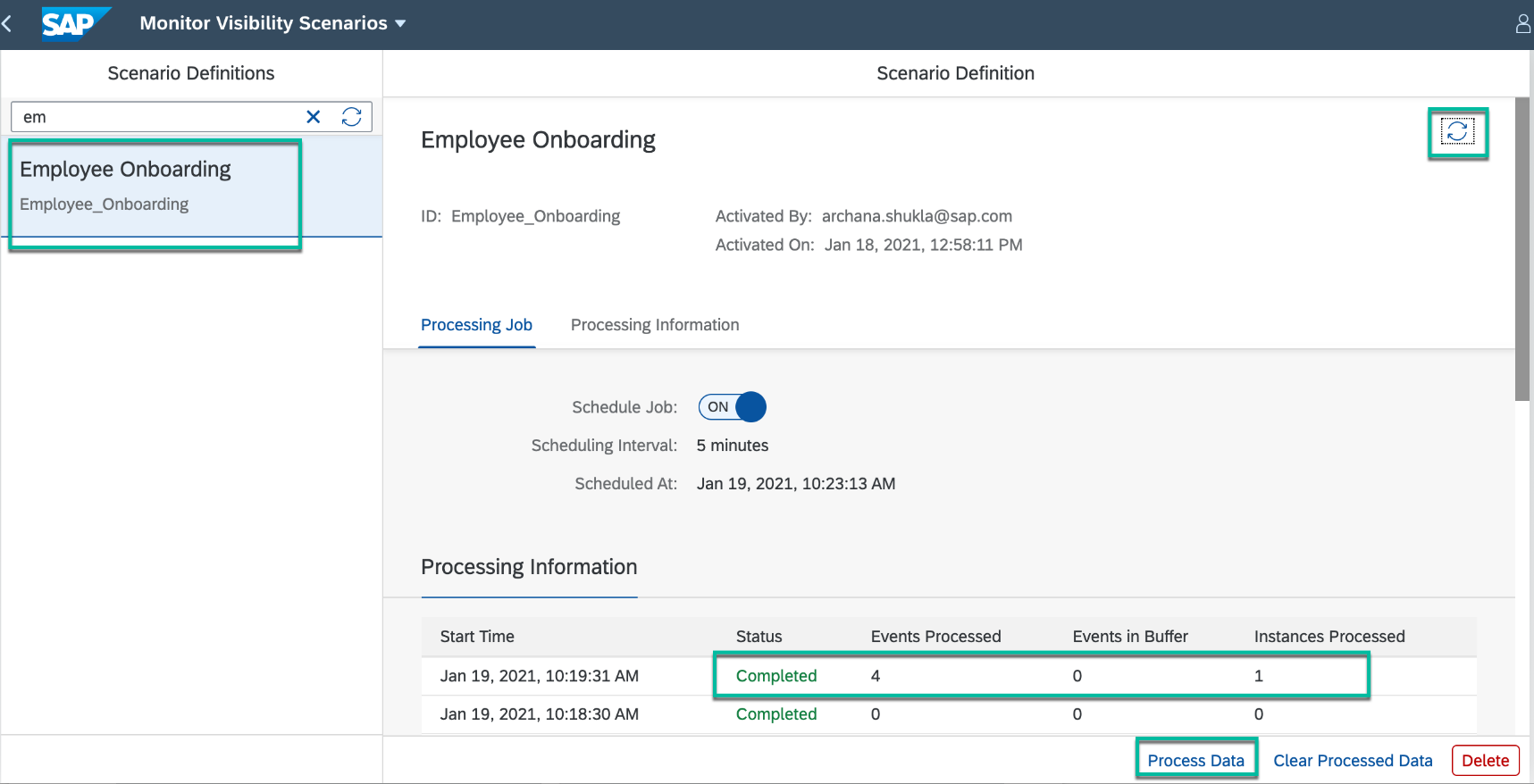 1. In the Workflow Management Fiori launchpad, open Monitor Visibility Scenarios application, click Process Data and Refresh to see the new batch of processed events.