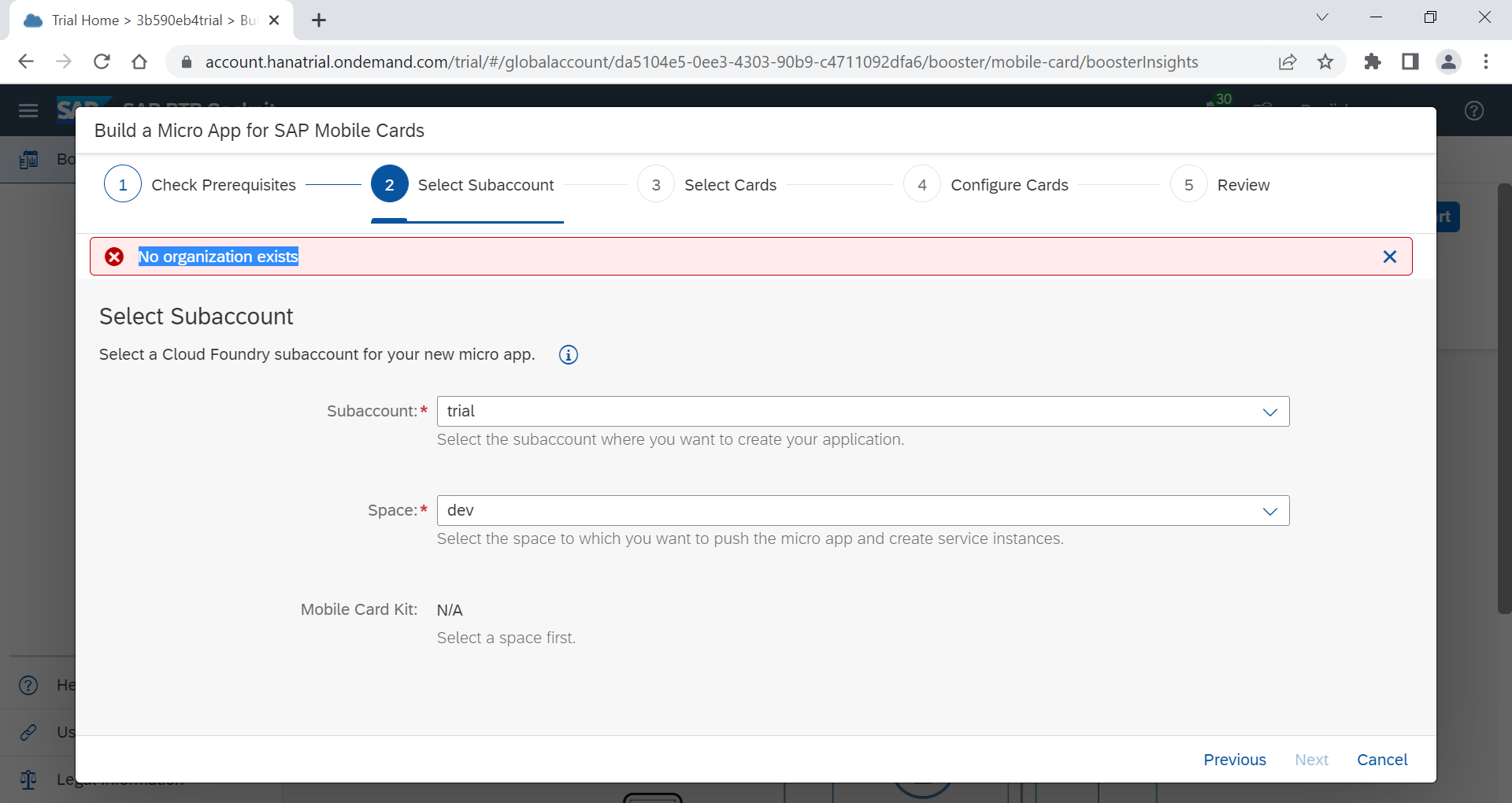 In the above mentioned tutorial, at Step 2, at the 9th sub-step, where 'Initialize mobile card' is clicked, an error is thrown which says 'No organization exists'. A link showing the screenshot of the error thrown, is mentioned below.
