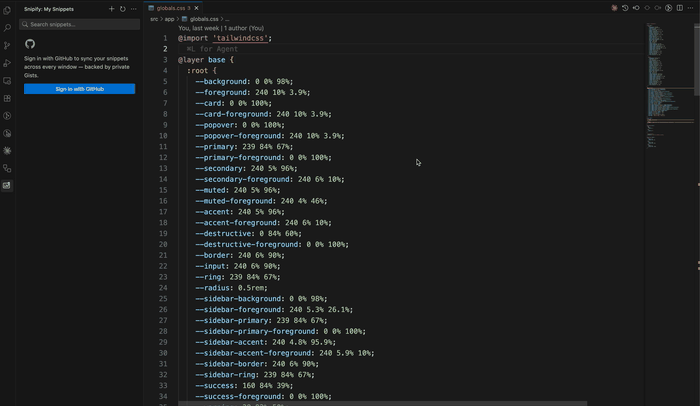 Ctrl+Shift+S/Cmd+Shift+Sto search and insert via quick pick - Hover a snippet to reveal pin, edit, and delete actions