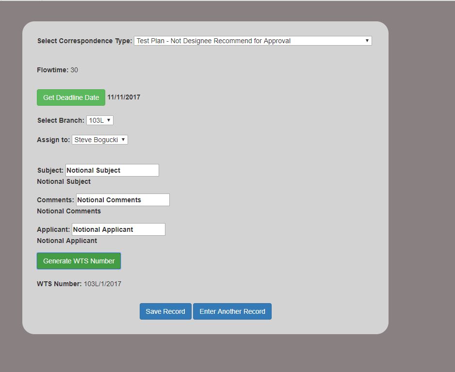 "Flowtime": Every Correspondence Type has its own specific Flowtime. The Flowtime is the amount of time allowed for the employee to complete the assignment. The Flowtime is added to the date that the Record is entered into the Work Tracking System to populate the deadline.