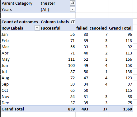 We first looked at the effect that launch date had on the outcomes of historical theater Kickstarter campaigns. To analyze this date, we relied on a pivot table to display the number of successful, failed, and canceled campaigns for each month.