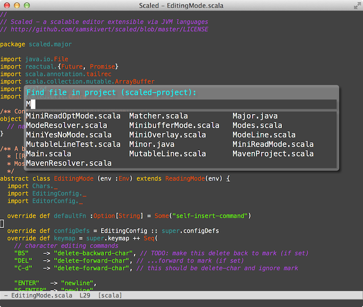 ProjectServiceis a service that a major mode can inject to gain access to "project services" (e.g. enumerate all files in the project, rebuild the project)ProjectFinderis a plugin used by the project service to allow other packages to provide code that identifies a project based on what it sees on the file system (apom.xmlfile, abuild.sbtfile, etc.) and provide code for operating on projects of that kindProjectModeis a minor mode which is automatically activated for any mode which is tagged withproject; the project minor mode adds key bindings for things like recompiling the project and annotating the appropriate buffers with warnings/errors