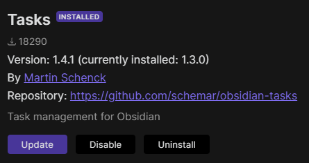 Thank you for getting back to me @schemar, and for taking the time to record that video. I am familiar with the process for installing plugins, and am very certain that I was trying to update (and, when that didn't work uninstall/re-install) Obsidian Tasks. The good news is that, whatever the cause was, it appears to now be resolved: a vault for which I'd repeatedly and unsuccessfully tried to update Tasks, which has been open all through this workday, now does have version 1.4.1. I opened another vault that has been closed since this morning (when I last tried to update Tasks), and it was still on 1.3.0: -- but this time when I clicked the Very weird indeed... |