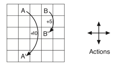 In it, for all the states (cells in the grid), each one of the actions (north, south, east, and west) is chosen with probability ¼. The agent then moves with probability 1 to the chosen direction. While moving, if the agent hits a wall, it cannot move and it receives a reward of -1; if moving to a cell in the grid, the reward is 0.; if it reaches cell A (1,2), it moves to cell A’ (5,2) and receives a reward +10; and, if it reaches cell B (1,4) it moves to cell B’ (3,4) and receives a reward +5.