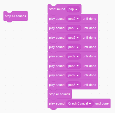 - Click the stack on the rightClick the stack on the leftAs soon as you click the stack on the left, the cymbal sound plays. In Scratch 2 it stops the current sound, but not the next ones (once you pop, you can’t stop) @fsih