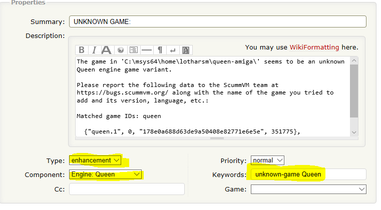 | g_system->openUrl("https://bugs.scummvm.org/newticket?summary=[UNK] Unknown game for engine " + _bugtrackerAffectedEngine + ": &description=" + _bugtrackerGameData + "&component=Engine%3A+"+_bugtrackerAffectedEngine+"&type=enhancement"+"&keywords=unknown-game "+_bugtrackerAffectedEngine); |