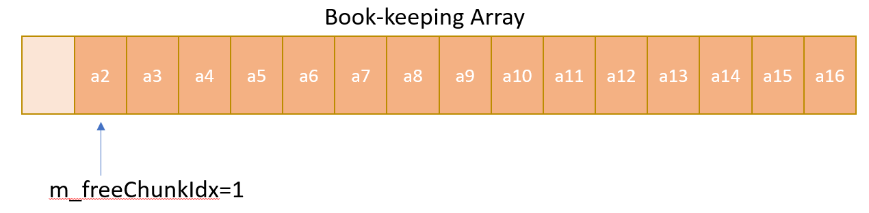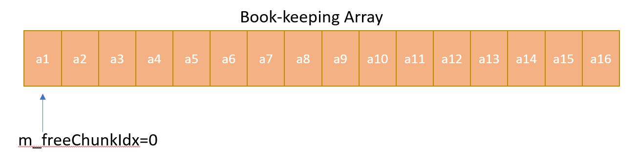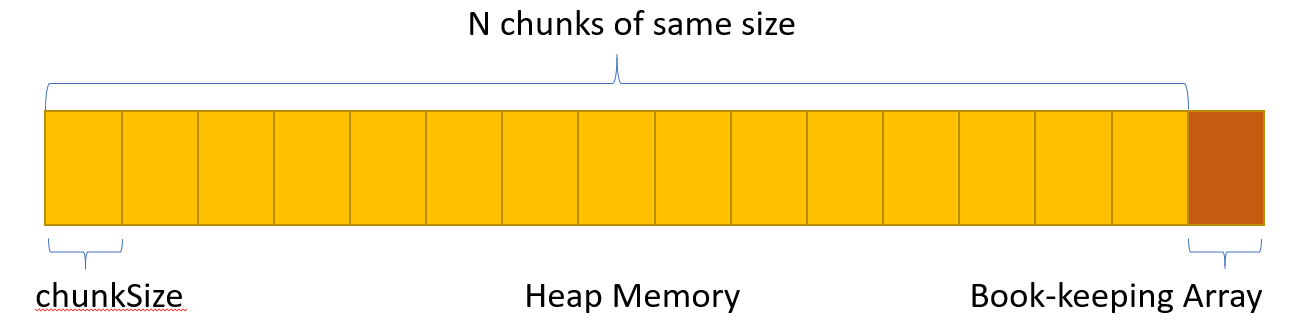 As described above, a contiguous array is kept aside for maintenance of the pools of equal chunks. Only two stack operations push() and pop() is required for book-keeping and these operations are implemented using an chunkIndex variable. Whenever an allocation is required pop() operation is imitated by reserving the address at current chunkIndex for allocation, and then incrementing the chunkIndex to point to next available address in the array. Similary, whenever a free is done push() operation is imitated by decrementing the chunk Index, and then storing the free address in the new chunk Index. This free address is now available for next requested allocation.