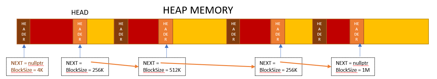 In this implementation, a pointer is kept to keep track of the head of the linked list. When an allocation is requested, it searches in the linked list for a block where the requested size of data can fit. Before sending the data to caller, we put some information to header of the chunk about the size of chunk and put a new header on the next free available slot with available block size. We also keep track of next available free chunk through a next pointer kept in the header. During deallocation, we get back the address from the caller, we read the allocation header to know the size of the block that we are going to push back to linked list. We traverse the linked list to put the free node back between prior free node and next free node. If the free block is contigous to other free blocks , we also merge those blocks to create bigger blocks.