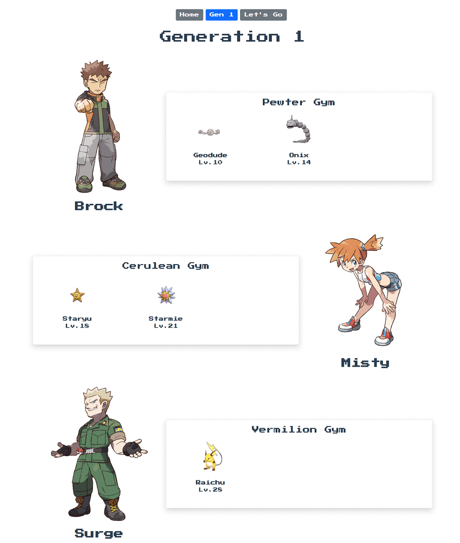 Vue Poke Gym Leaders Data Visualization Blog Article Project setup npm install Compiles and hot-reloads for development npm run serve Compiles and minifies for production npm run build Customize configuration See Configuration Reference. License Designed By sdwh.dev Pokémon Images & Data Copyright From bulbagarden & Pokémon Database All Pokémon images & names © 1995-{{ new Date().getFullYear()}} Nintendo/Game Freak.
