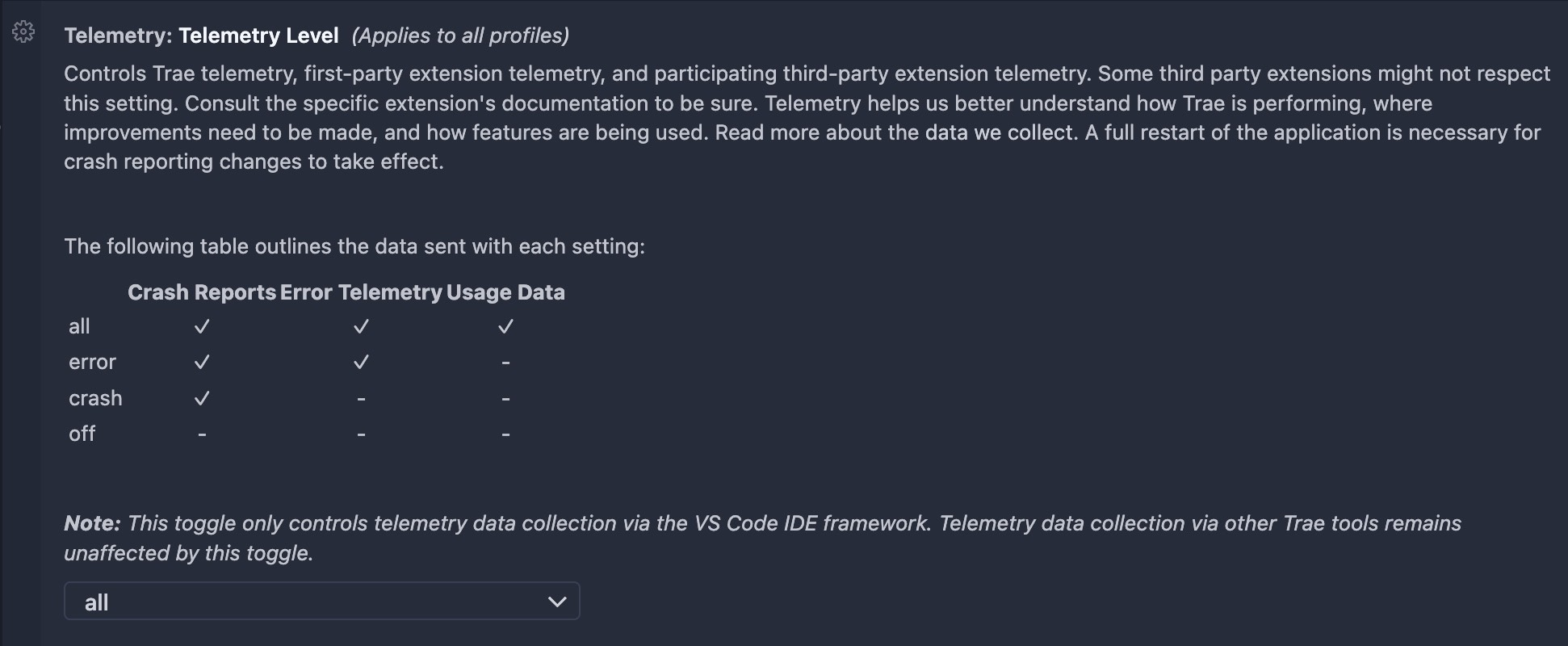 Being a fork of VSCode, Trae inherits most of its core features — including the telemetry configuration UI.