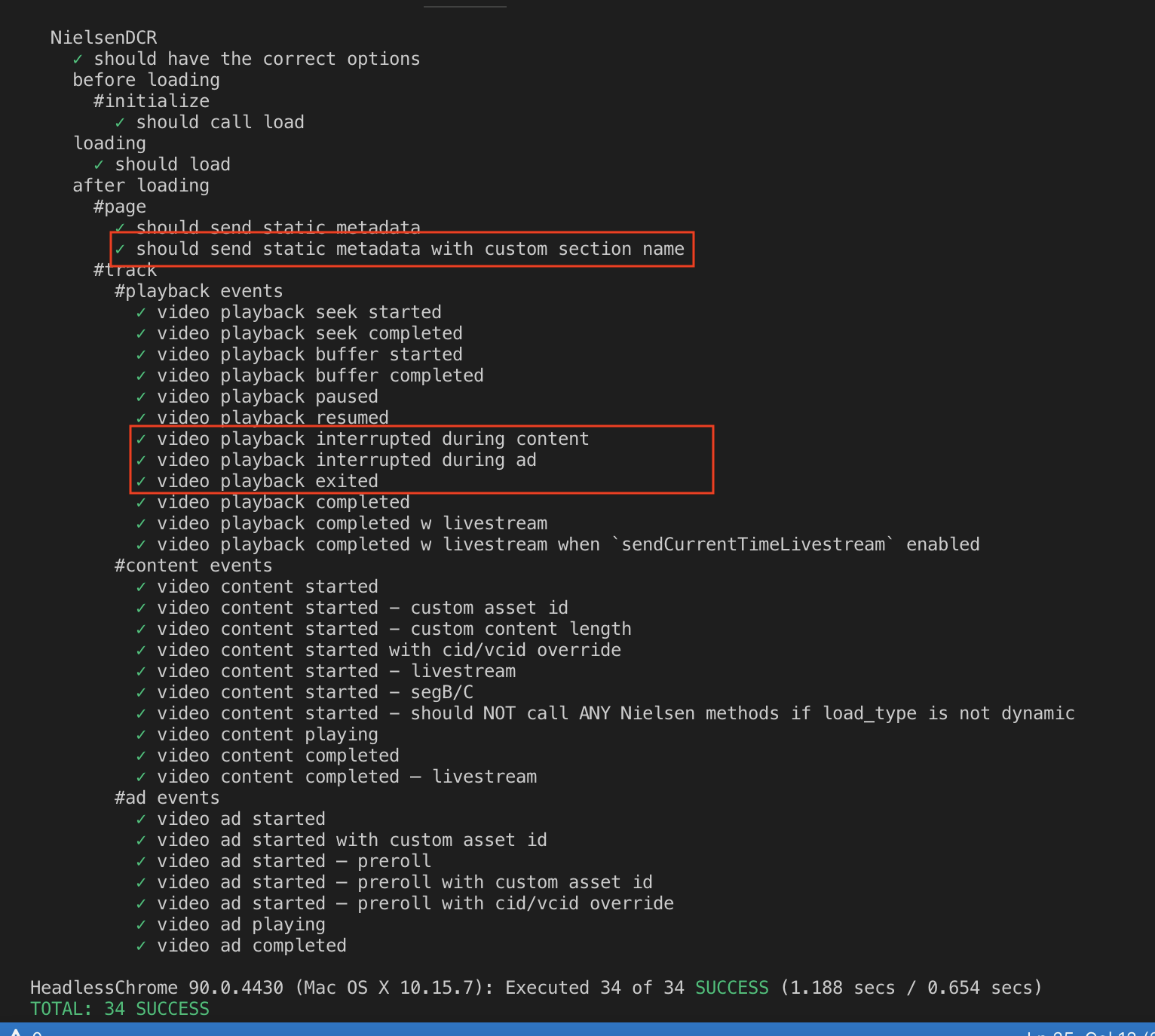 Unit Tests - all passed, including new (for video playback exited) and changed tests. Removed two tests that are no longer relevant as Nielsen has requested we do not call