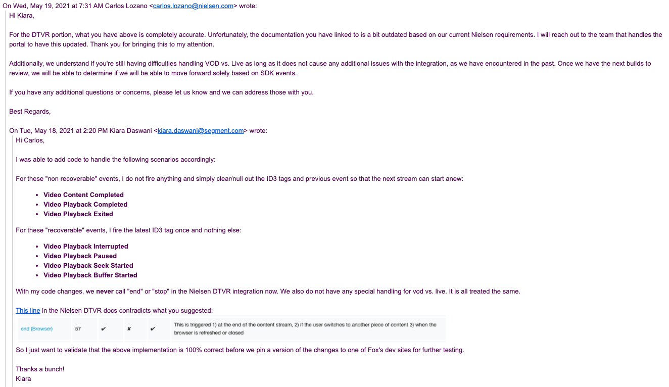 Hi @bsneed! I have made changes to our Nielsen DCR and DTVR web integrations, as requested by Nielsen. The changes made are outlined in the linked spreadsheet and JIRA. I've already made similar changes on iOS and Android so this is the last platform we need to tackle. I added some new unit tests and locally tested, and everything looks good. Would you or someone on the Libraries team be able to review and approve my changes? I'm newer to releasing web device-mode changes, but in the past we have pinned Fox's staging source(s) to a version of a.js with the changes so that they could test before we add to a release train. Is this possible? @brennan has helped with this in the past. thanks! |
