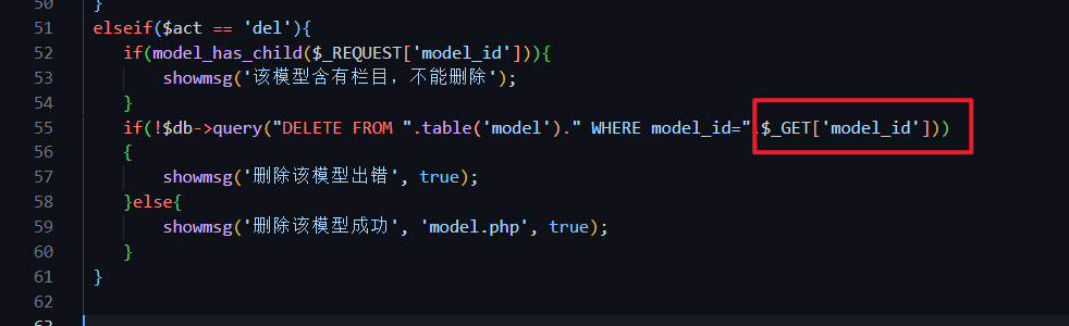 There is numeric injection for $_GET['model_id']