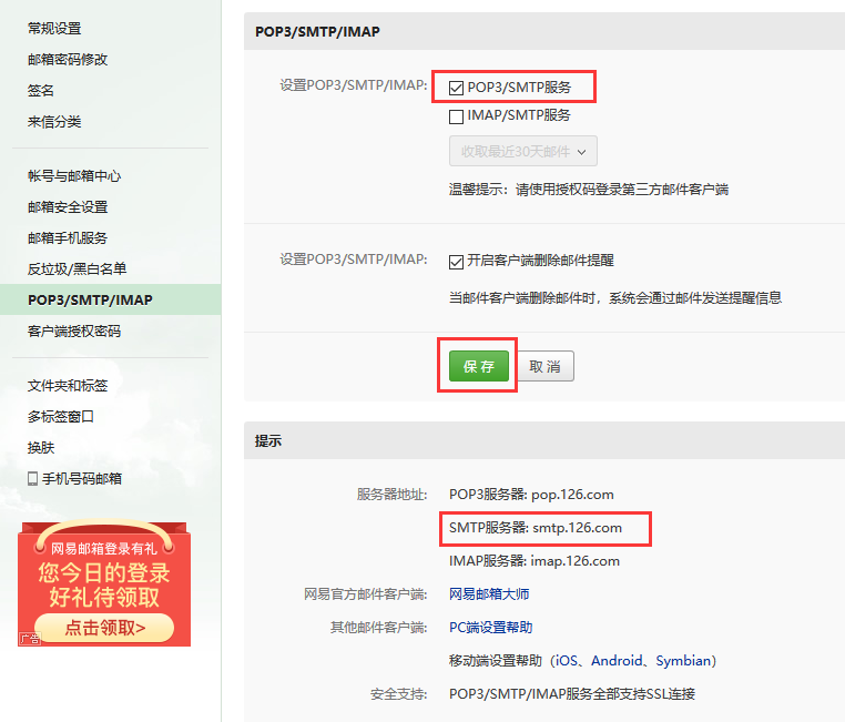 --- >[网易官方的科普:什么是SMTP?](http://help.163.com/09/1223/14/5R7P6CJ600753VB8.html) --- **第一步**:在设置中找到SMTP选项  --- **第二步**:勾选SMTP选项并保存,可以在下面看到SMTP的Host地址,在代码中要用到  --- **第三步**:设置授权码  ---