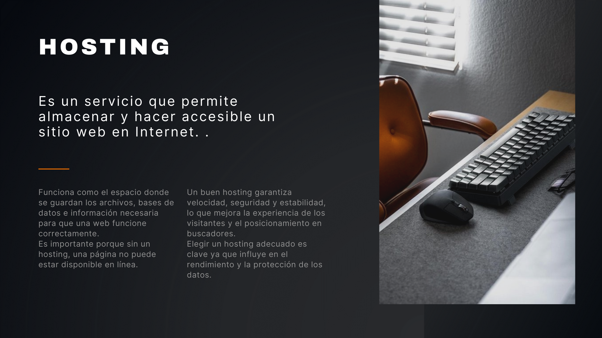 Funciona como el espacio donde se guardan los archivos, bases de datos e información necesaria para que una web funcione correctamente. Es importante porque sin un hosting, una página no puede estar disponible en línea.