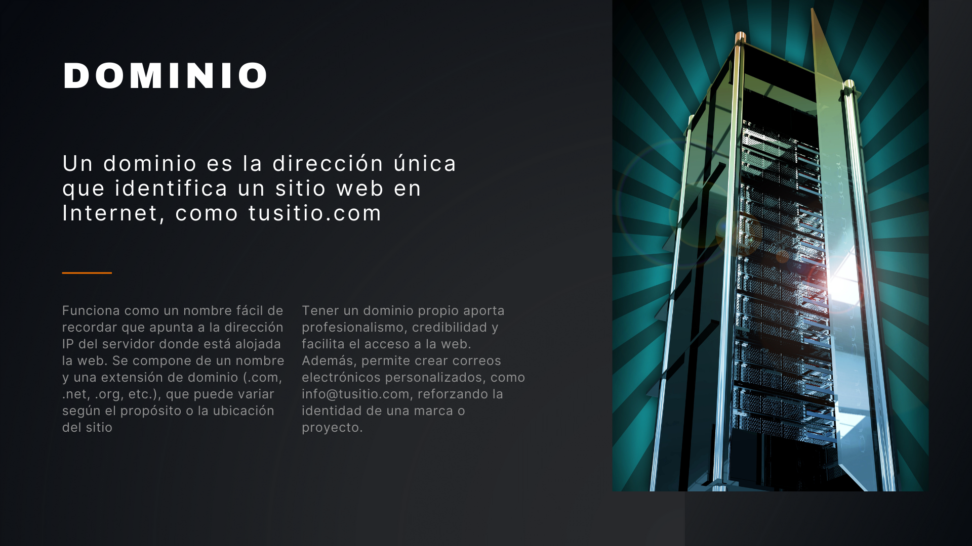 Un dominio es la dirección única que identifica un sitio web en Internet, como tustito.com.